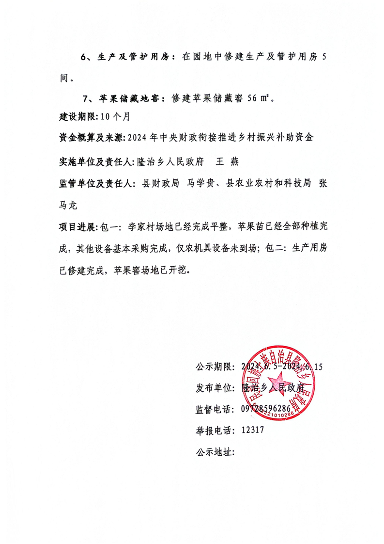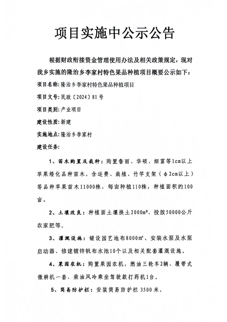 隆治乡李家村特色果品种植项目县级实施中公示公告