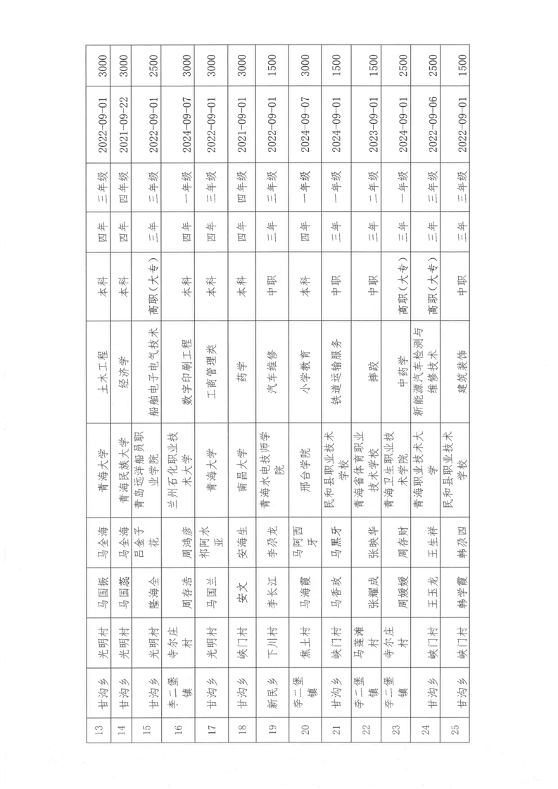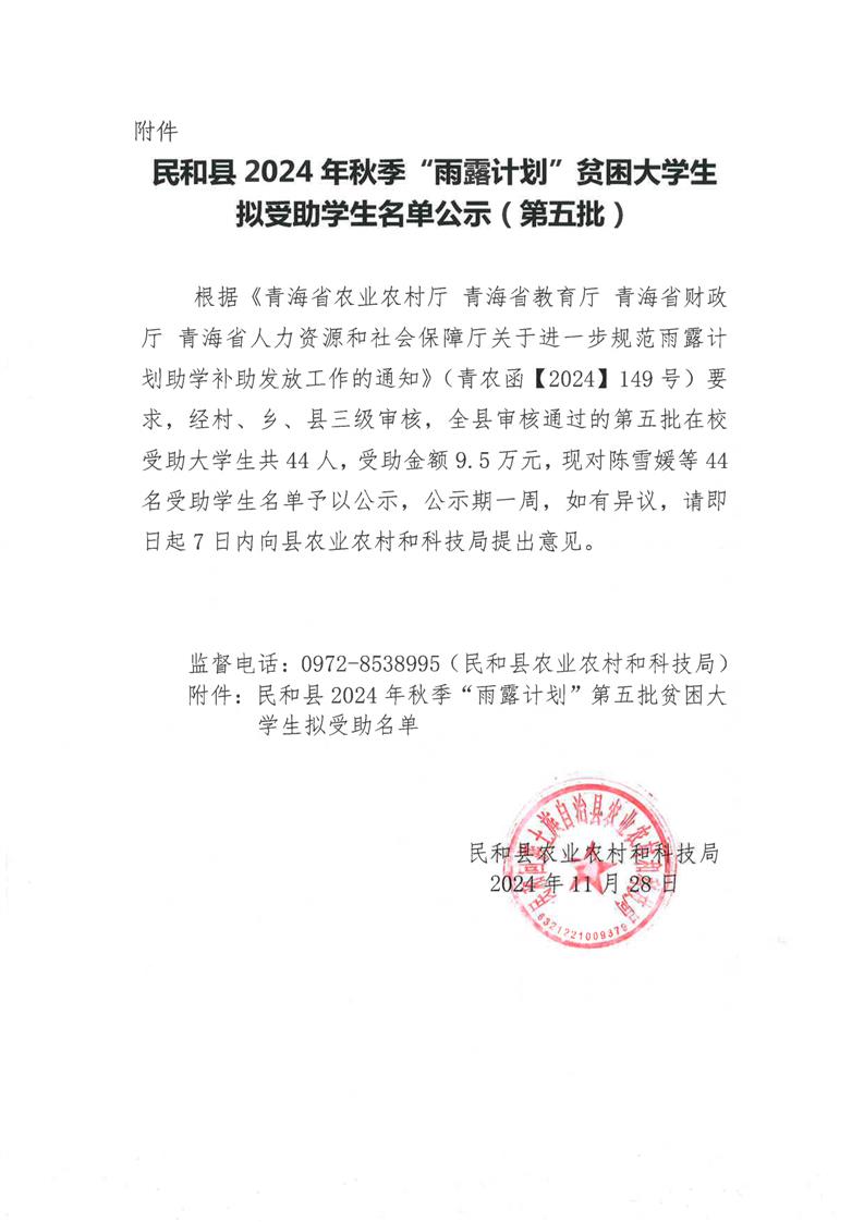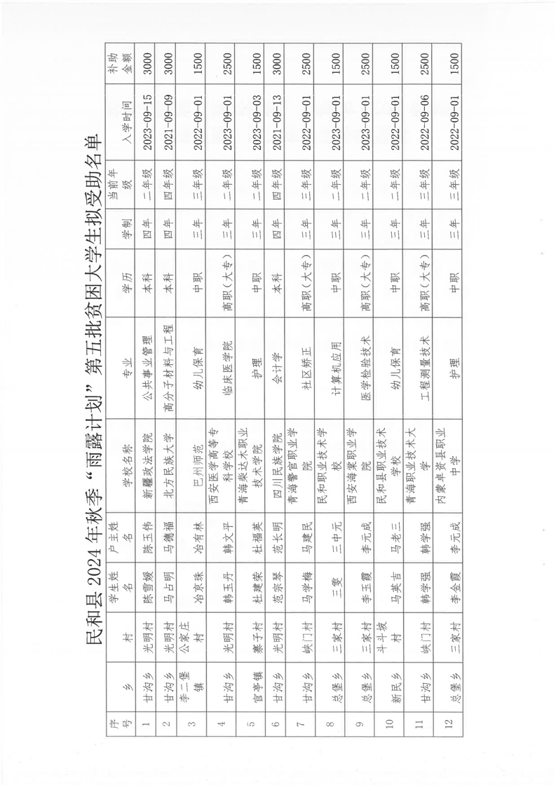 民和县2024年秋季“雨露计划”贫困大学生拟受助学生名单公示(第五批)
