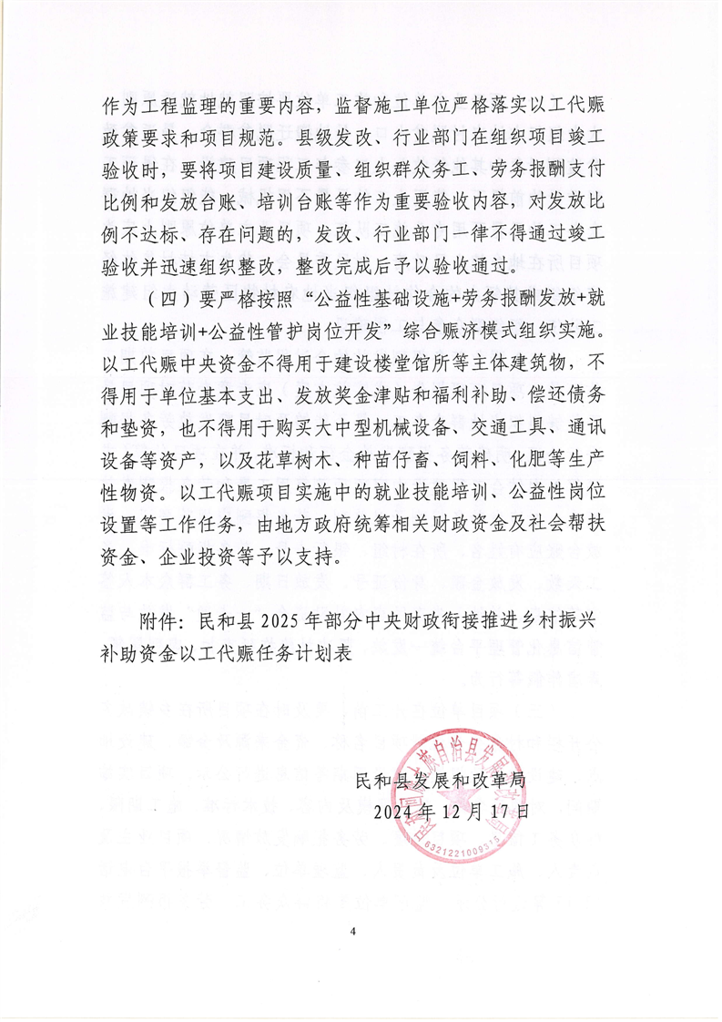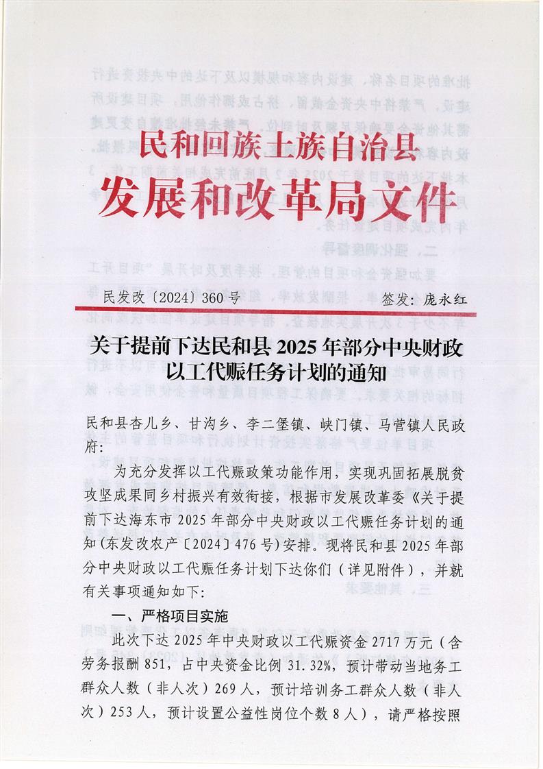 关于提前下达民和县2025年部分中央财政以工代赈任务计划的通知