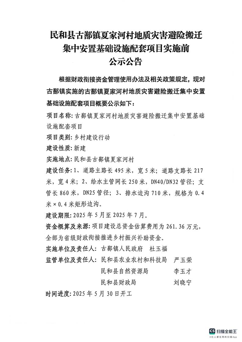 古鄯镇夏家河村地质灾害避险搬迁集中安置基础设施配套项目实施前公示公告