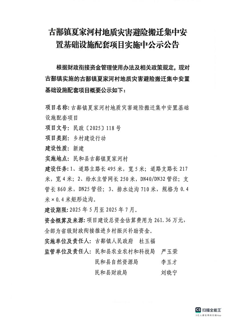 古鄯镇夏家河村地质灾害避险搬迁集中安置基础设施配套项目实施中公示公告