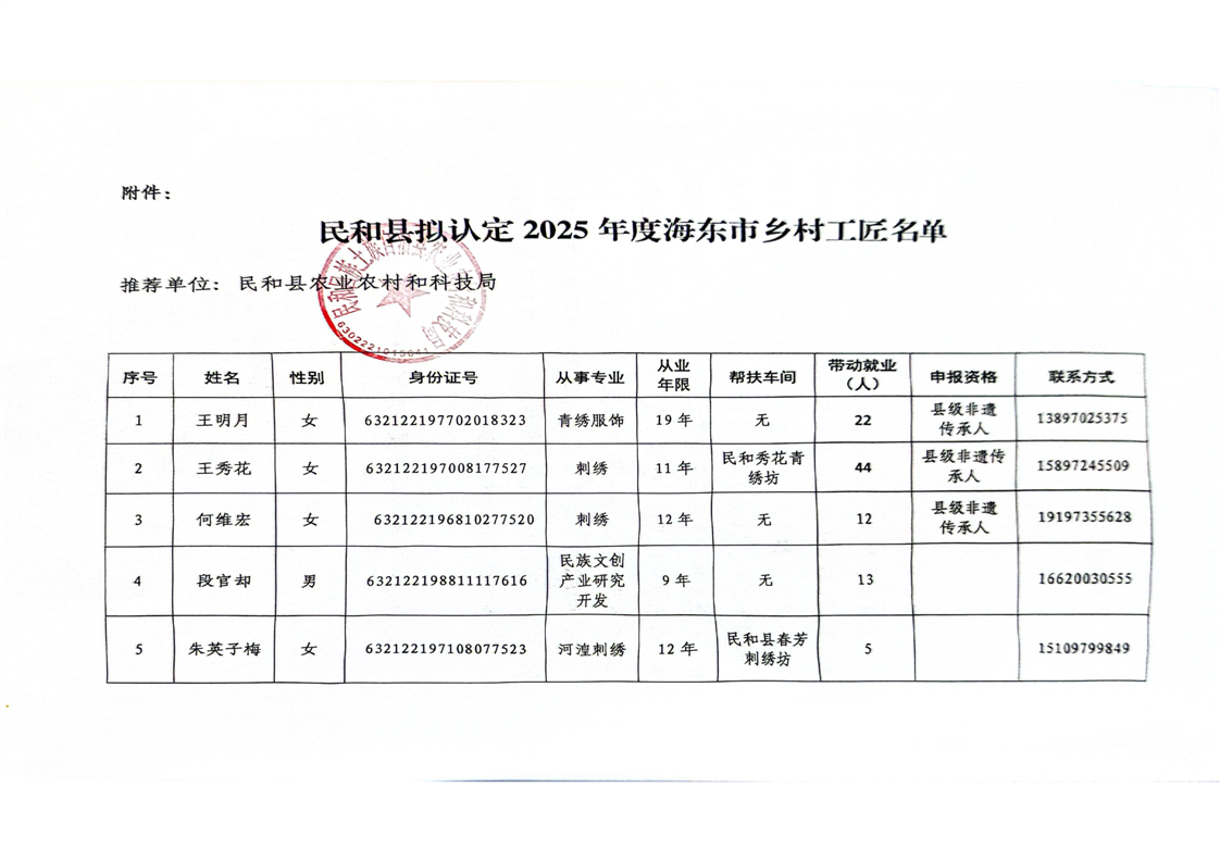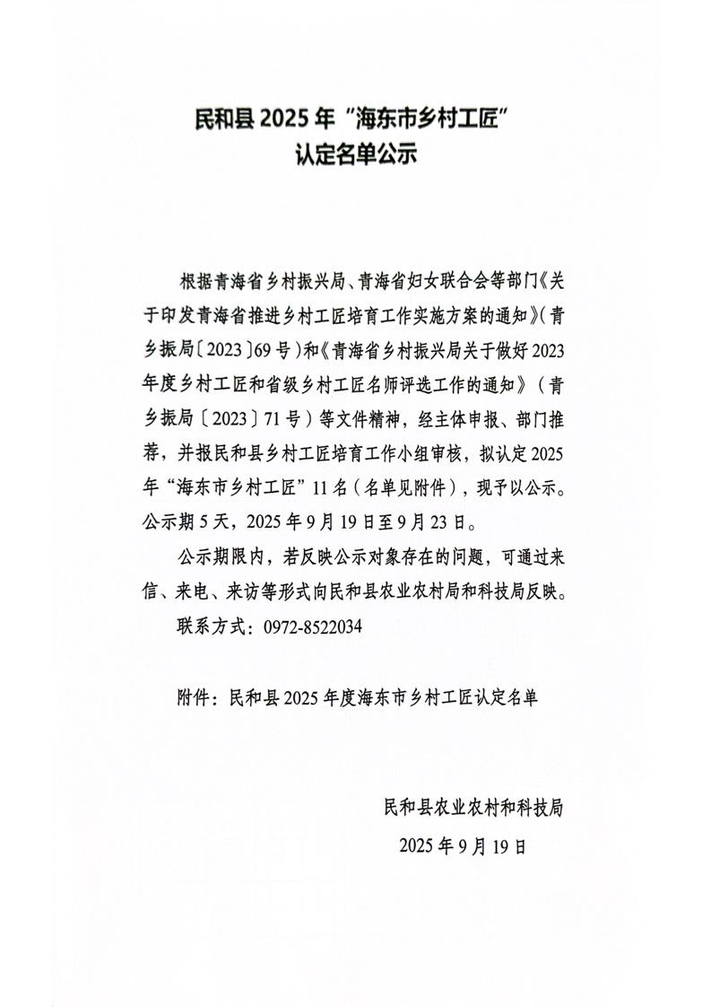 根据青海省乡村振兴局、青海省妇女联合会等部门《关于印发青海省推进乡村工匠培育工作实施方案的通知》(青乡振局〔2023〕69号)和《青海省乡村振兴局关于做好2023年度乡村工匠和省级乡村工匠名师评选工作的通知》(青乡振局〔2023〕71号)等文件精神,经主体申报、部门推荐,并报民和县乡村工匠培育工作小组审核,拟认定2025年“海东市乡村工匠”11名(名单见附件),现对王明月等11名“海东市乡村工匠”名单,予以公示。