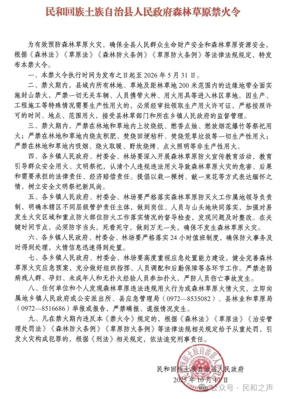 民和回族土族自治县人民政府森林草原禁火令