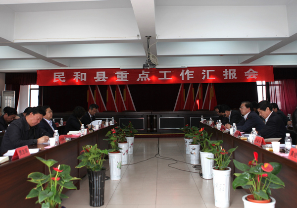 海东地委书记于丛乐,地委副书记、行署专员金长华听取民和县重点工作汇报