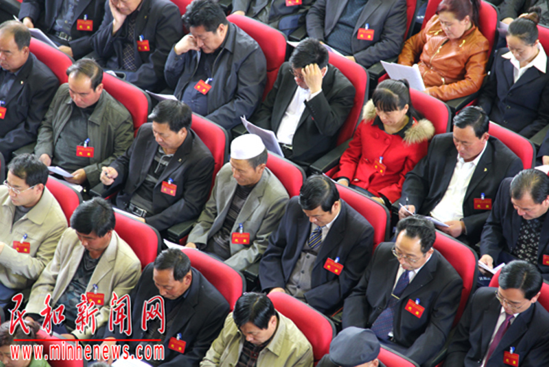 与会代表认真聆听沙德林代表县人民政府所作的政府工作报告
