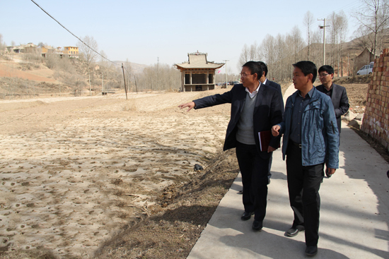省委组织部副部长王志明(左)在西沟乡麻地沟共建村调研广场选址