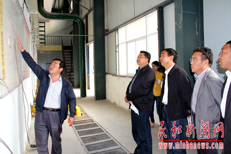 海东地委委员、县委书记赵雄(左一)在县工业园常务副主任曹云泰、副县长朵海生等领导陪同下到下川口水厂调研工业园用水供应情况