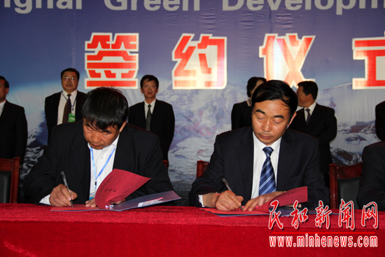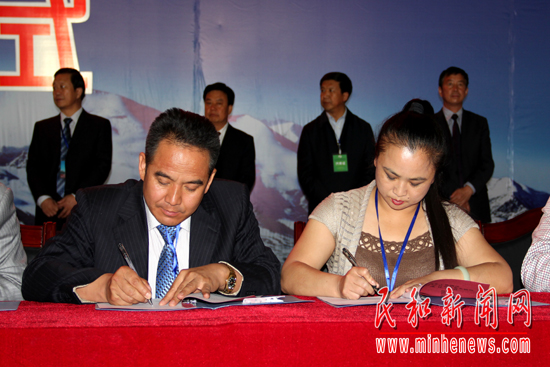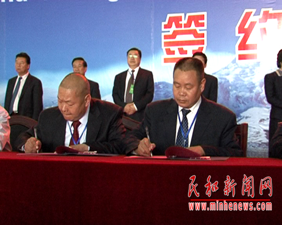 副县长朵海生(右)与青海省三江水电开发股份有限公司负责人签约大河家水电站项目