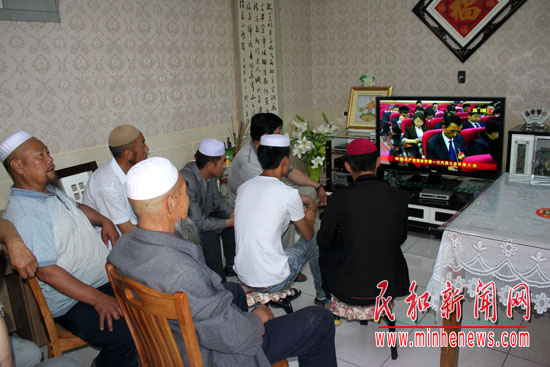川口镇南庄子村村主任曹迎喜组织在家党员及群众收看海东市第一次党代会开幕式盛况