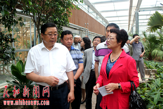 海东市委常委、民和县委书记赵雄向省工商联副主席魏勤介绍民和现代农业发展情况