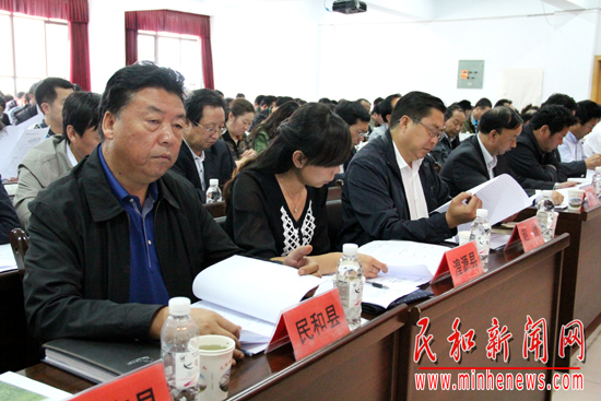 海东市委常委、副市长、民和县委书记赵雄(左三),民和县人民政府县长沙德林(左一)出席会议