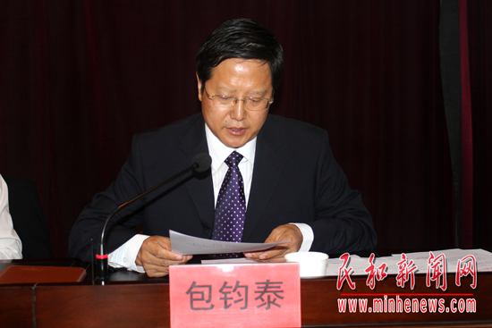 县委常委、组织部部长包钧泰宣读《关于成立民和县创建民族团结进步先进区工作领导小组的通知》