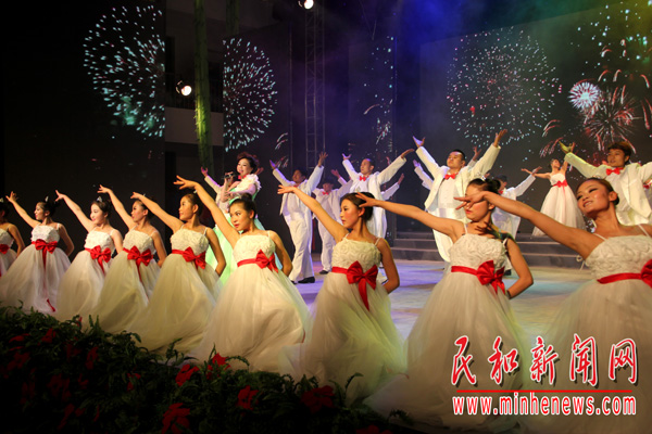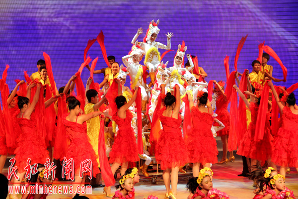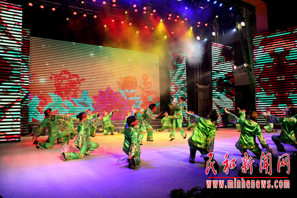 个节目组成。节奏明快的表演唱《亲家母逛新城》以县城建设、幸福生活为唱词,颂扬了党的惠民政策带来的新变化,展现了民和城市建设取得的辉煌成就,赞美了全县各族群众幸福和谐的新生活。舞蹈《鼓舞太平》气势雄宏,鼓声振振,敲出了民和人民建设魅力新民和的信心和决心。彝族舞蹈《花萝》、小品《爱的誓言》、《秦腔联唱》等节目贴近生活,情感真挚,感人肺腑,将晚会现场一次次推向了高潮,迎来了现场观众阵阵掌声。