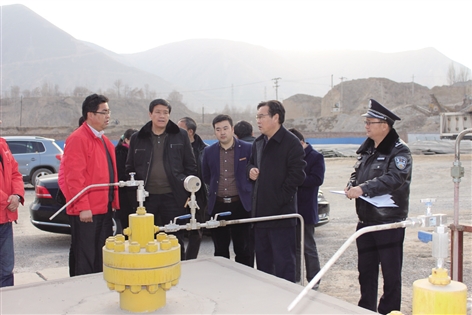1月15日,民和县副县长朵海生(右二)等一行到民和川中天然气有限责任公司进行消防安全检查,重点检查天然气站防爆、防火、防雷和应急疏散预案、消防责任制的落实等情况及消防器材运行情况。