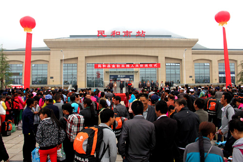 9月9日上午10:48分,伴随着一声汽笛的长鸣, D9989次高速列车将首次把609名采棉工的梦想载向天山脚下的银海棉田。兰新高铁全线开通以来,民和县赴疆采棉专列也进入高铁新时代。今年民和县计划输出赴疆采棉工2.2万人,其中协调青藏铁路公司动车专列输送3600人。 石延寿 摄