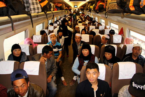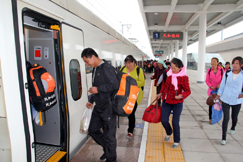 满载采棉群众的D9989次列车从高铁民和南站出发 石延寿 摄