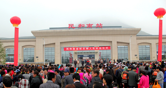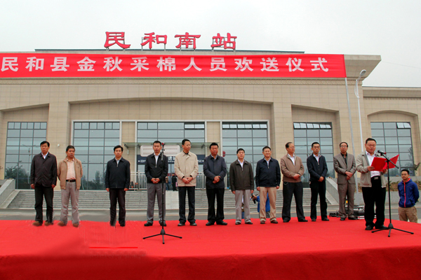 当日上午9时,民和县委、县政府在高铁民和南站站前广场举行了2015年首批金秋采棉务工人员欢送仪式。省人力资源和社会保障厅厅长杨颐、副厅长宋令文,省就业局局长邢建波,省人社厅就业和农民工工作处调研员仲海东,海东市委常委、副市长孙德,海东市人力资源和社会保障局副局长韩进良,民和县政府县长沙德林,县人大常委会副主任王晓明,县政协副主席李珍,青藏铁路公司西宁火车站站长殷靖全等领导出席了欢送仪式。
