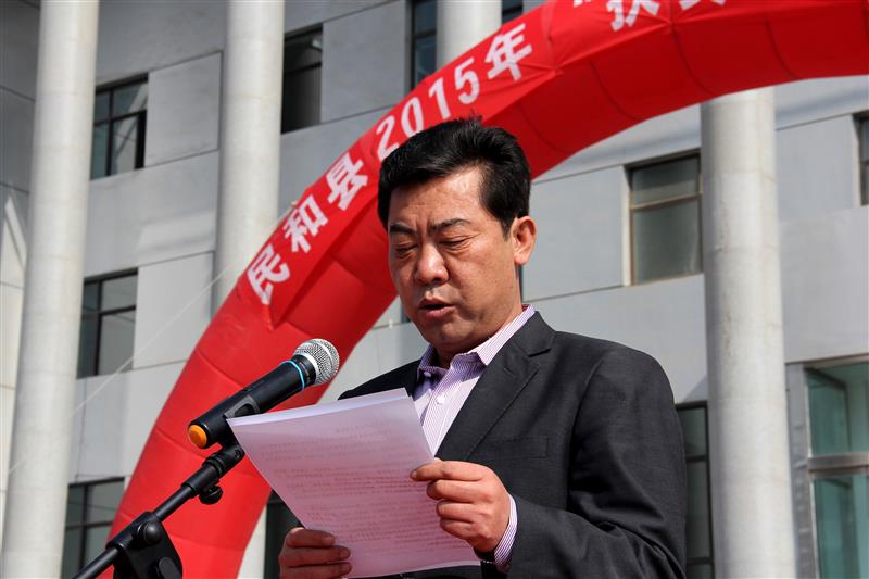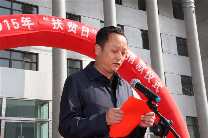 县扶贫日活动领导小组办公室主任、县扶贫局局长密炯宣读《民和县“扶贫日”活动捐款倡议书》