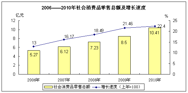 全年实现社会消费品零售总额达10.41亿元,增长22.40%。其中:城镇5.51亿元,增长22.58%;乡村4.90亿元,增长22.20%。分行业看:批发业零售额3.19亿元,增长20.33%;零售业零售额5.02亿元,增长22.98%;餐饮业零售额2.20亿元,增长24.16%。