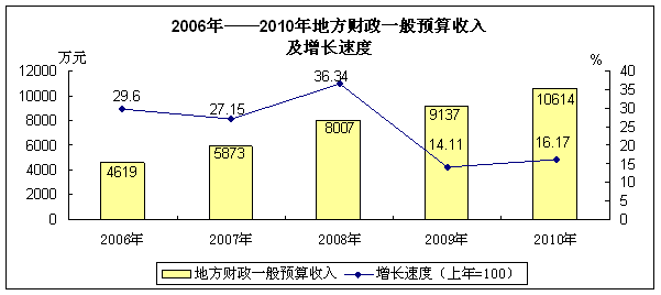完成地方财政一般预算收入完成10614万元,比上年增加1477万元,增长16.17%,完成年度预算的102.35%。全县财政一般预算支出完成143166万元,比上年增加44306万元,增长44.82%。其中:一般公共服务支出10100万元,增长22.89%。