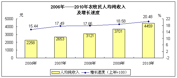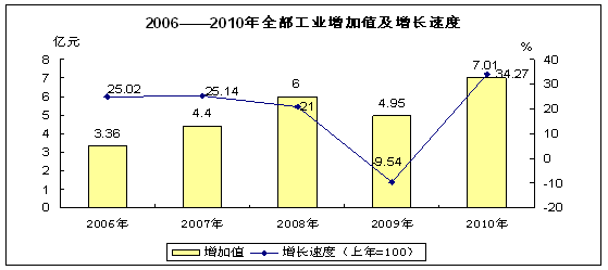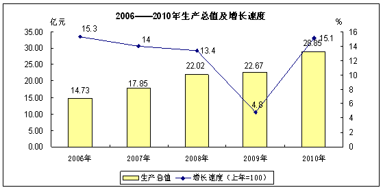 初步核算,2010年全县完成生产总值28.85亿元,比上年增长15.1%;人均生产总值7116元,比上年增长12.7%。第一产业增加值6.66亿元,增长8%;第二产业增加值10.01亿元,增长26.5%;第三产业增加值12.18亿元,增长9.5%。