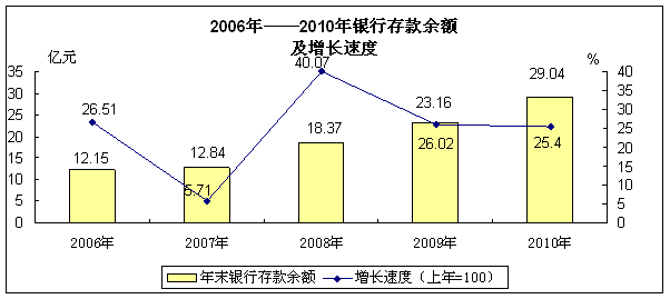 年末全县金融机构各项存款余额29.04亿元,比年初增加5.88亿元,增长25.40%。其中:城乡居民储蓄存款17.92亿元,比年初增加3.77亿元,增长26.63%。各项金融贷款余额6.98亿元,比年初增加1.92亿元,增长38.04%。