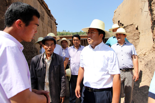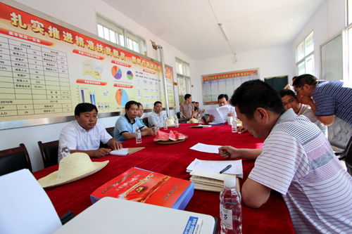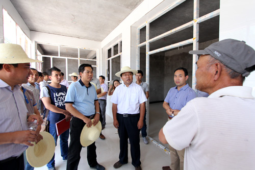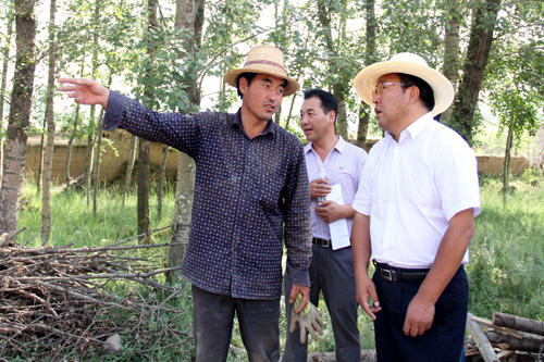 县长马维忠(左一)一行在杏儿乡日扎村观摩整体脱贫情况时听取第一书记工作汇报