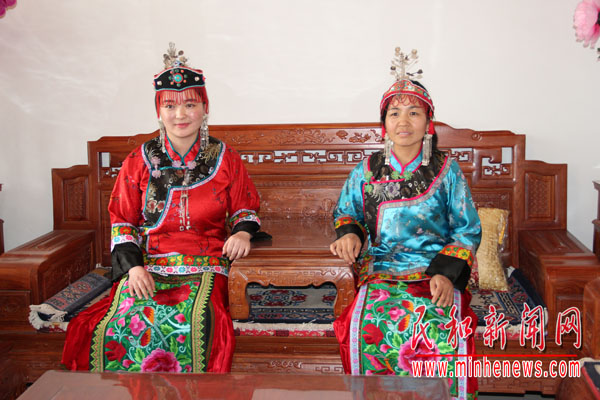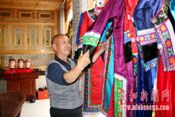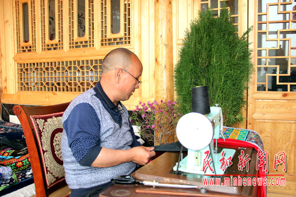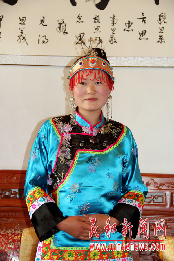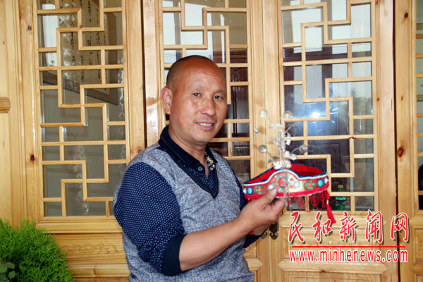 一边学习,一边亲手创作,凭着小时候娴熟的针线技术,如今,他已赶制了10多套土族服饰和头饰。看着庄重、美丽的土族服饰,前来观看的村民马兰英惊讶不已。马兰英告诉笔者:“现在做土族服装的也有,但与这真没法比,这服装真正展现了土族服装的精美和庄重,穿起来肯定漂亮。”
