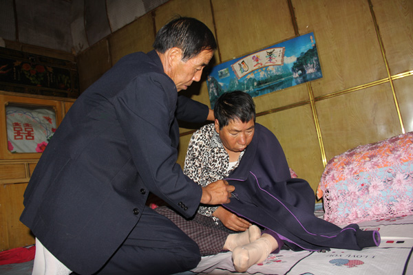 多年的轮椅生活,妻子白清明患上脑神经错乱症,犯病时口无遮掩地谩骂、撕扯衣物、随手乱扔东西,而在白登奎的眼里,这一切习以为常。至今,在白登奎的小腿上依然留着妻子用铁拐杖敲击过的伤痕。