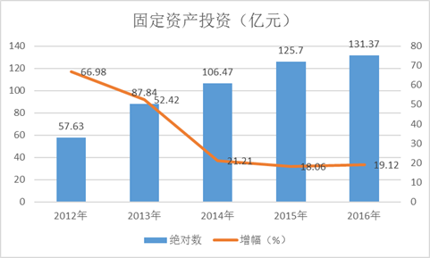 行政辖固定资产投资完成131.37亿元,增长19.12%。分产业看:第一产业完成投资12.6亿元,增长1.28%;第二产业完成投资22.01亿元,下降28.93%,其中工业固定资产投资完成20.88亿元,下降32.14%;第三产业完成投资96.75亿元,增长42.01%。