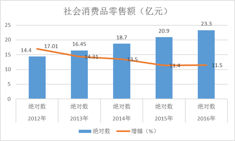 实现社会消费品零售总额23.3亿元,增长11.45%。其中:城镇12.37亿元,增长11.73%;乡村10.92亿元,增长11.16%。分行业看:批发业零售额7.29亿元,增长11.37%;零售业零售额11.32亿元,增长11.68%;餐饮业营业额4.66亿元,增长11%。住宿业营业额2.12亿元,同比增长4%。