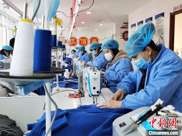图为昔日贫困户在民和县北山乡“扶贫工厂”加工服装。 张添福 摄