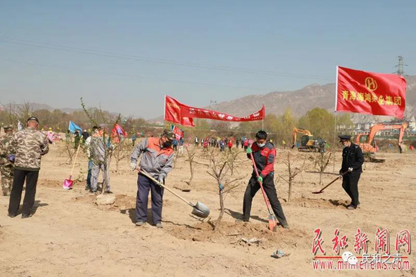 4月8日,正在建设中的民和回族土族自治县麻荒滩湿地公园彩旗招展,人影忙碌,1200多名干部群众齐聚这里参加春季义务植树大会战。