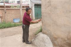 记者在马守善家的后墙处看到,为了减少裂缝对墙体的影响,墙体底部已经由水泥墩子固定,已被移进去的墙体在水泥路上还留有黄色的泥水痕迹。