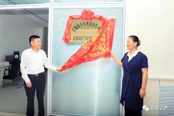 图为滨湖区区长陈锡伦与民和县政府副县长王明芳共同为滨湖-民和共建医学影像诊断中心揭牌
