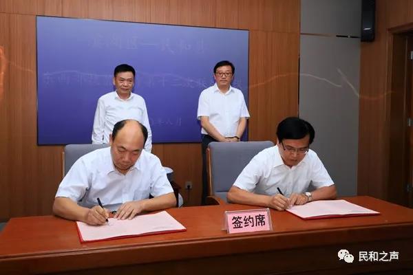 图为在民和县委书记杨海林、滨湖区区长陈锡伦的共同见证下签订村企合作协议