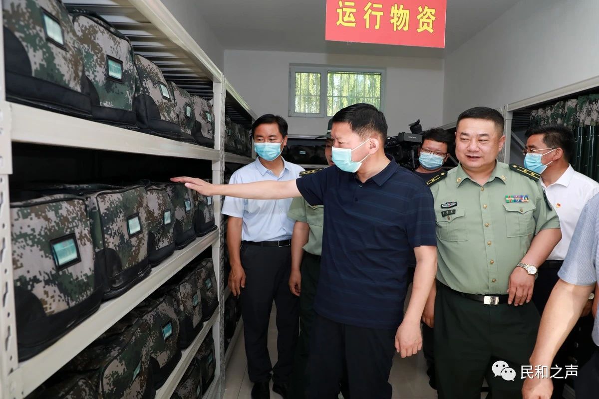 图为县委书记毛学鸿在县人民武装部慰问期间参观战备器材库,了解战备物资储存管理情况