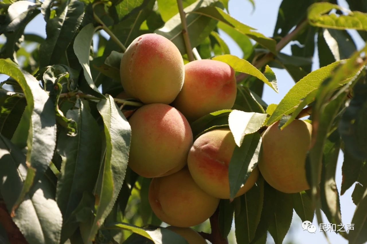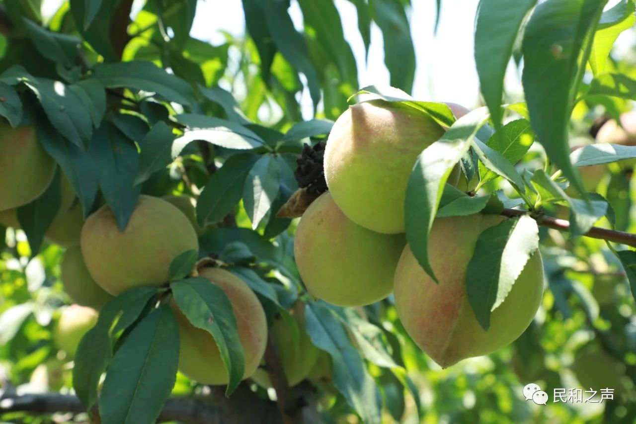 走进枝繁叶茂的桃林,映入眼帘的满枝硕果。伴随着夏日的热风,鼻息间时不时还送来一阵淡淡的桃香。拨开丛密的桃叶,半红半青的桃子发出诱人的芳香,看着令人垂涎。采一个鲜桃品尝,果肉脆鲜,香甜爽口。