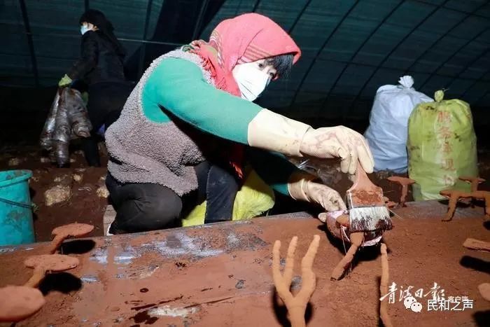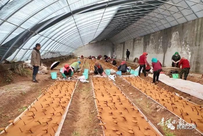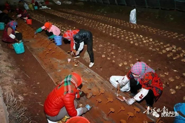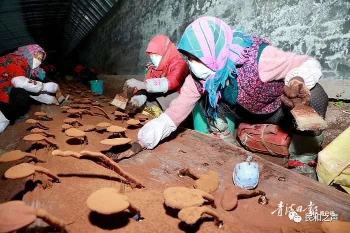 10月19日,记者走进海东市民和回族土族自治县官亭镇赵木川村的“黄河彩篮”基地,20余棚灵芝喜获丰收,20多名当地务工群众早出晚归忙收获。
