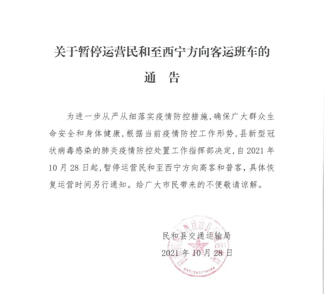 为进一步从严从细落实疫情防控措施,确保广大群众生命安全和身体健康,根据当前疫情防控工作形势,县新型冠状病毒感染的肺炎疫情防控处置工作指挥部决定,自2021年10月28日起,暂停运营民和至西宁方向高客和普客,具体恢复运营时间另行通知。给广大市民带来的不便敬请谅解。