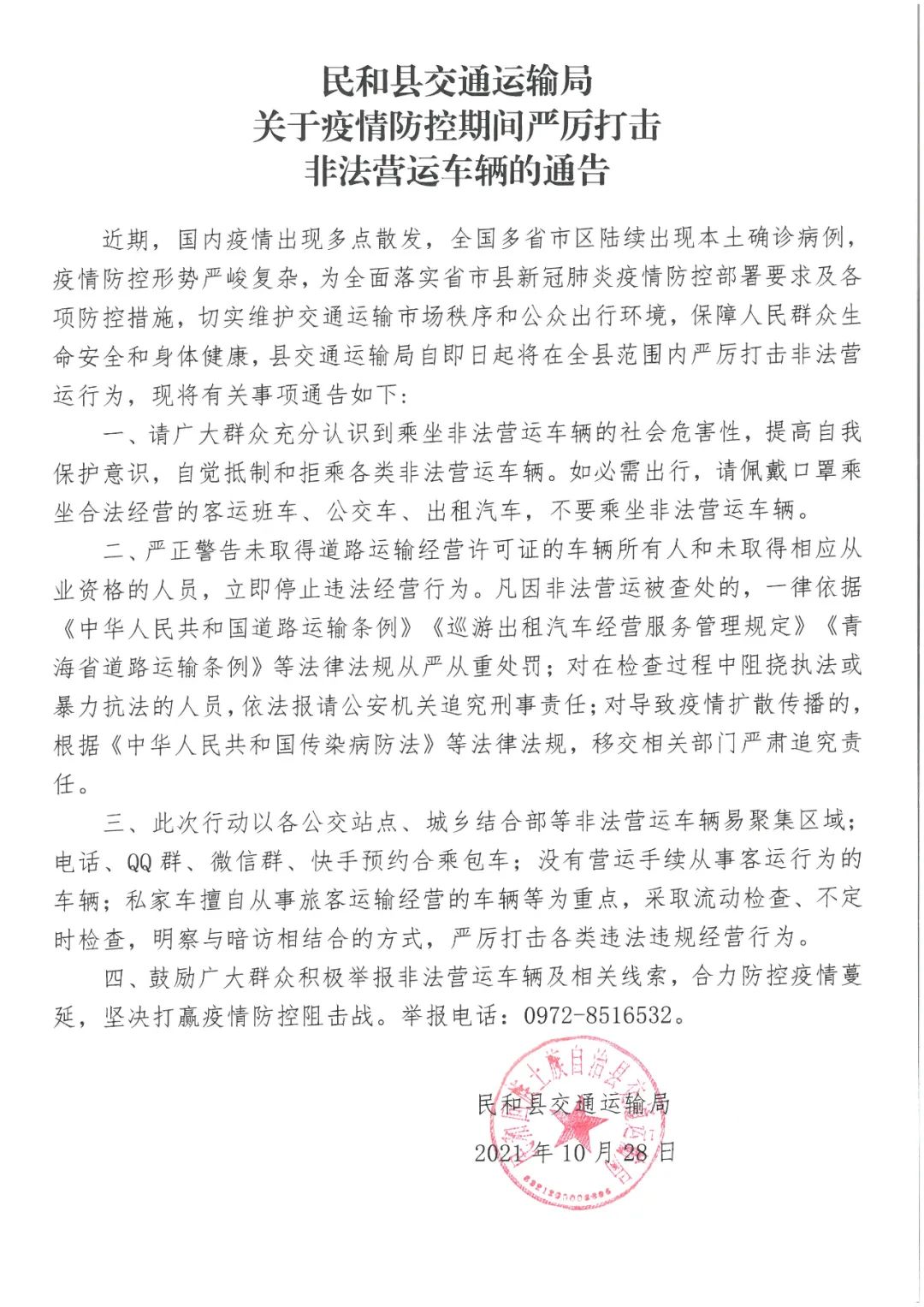 近期,国内疫情出现多点散发,全国多省市区陆续出现本土确诊病例,疫情防控形势严峻复杂,为全面落实省市县新冠感染疫情防控部署要求及各项防控措施,切实维护交通运输市场秩序和公众出行环境,保障人民群众生命安全和身体健康,县交通运输局自即日起将在全县范围内严厉打击非法营运行为,现将有关事项通告如下: 一、请广大群众充分认识到乘坐非法营运车辆的社会危害性,提高自我保护意识,自觉抵制和拒乘各类非法营运车辆。如必需出行,请佩戴口罩乘坐合法经营的客运班车、公交车、出租汽车,不要乘坐非法营运车辆。 二、严正警告未取得道路运输经营许可证的车辆所有人和未取得相应从业资格的人员,立即停止违法经营行为。凡因非法营运被查处的,一律依据《中华人民共和国道路运输条例》《巡游出租汽车经营服务管理规定》《青海省道路运输条例》等法律法规从严从重处罚;对在检查过程中阻挠执法或暴力抗法的人员,依法报请公安机关追究刑事责任;对导致疫情扩散传播的,根据《中华人民共和国传染病防治法》等法律法规,移交相关部门严肃追究责任。 三、此次行动以各公交站点、城乡结合部等非法营运车辆易聚集区域;电话、QQ群、微信群、快手预约合乘包车;没有营运手续从事客运行为的车辆;私家车擅自从事旅客运输经营的车辆等为重点,采取流动检查、不定时检查,明察与暗访相结合的方式,严厉打击各类违法违规经营行为。 四、鼓励广大群众积极举报非法营运车辆及相关线索,合力防控疫情蔓延,坚决打赢疫情防控阻击战。