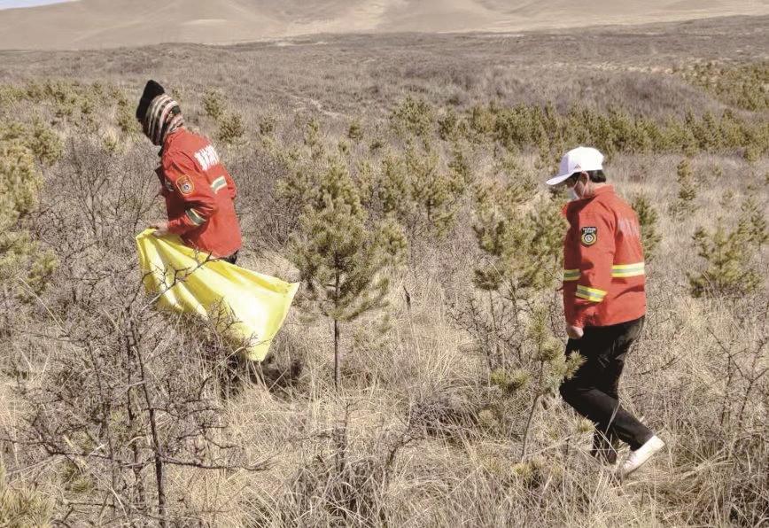 华什才夫妇在林区一边巡护一边捡拾垃圾。摄影:张卫平