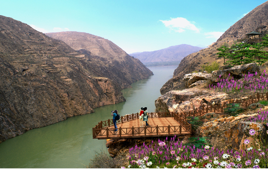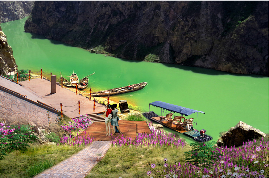 景区成立了民和禹川生态旅游开发有限公司,已建成风景区服务中心(四合院),内设水文化展览室、豆腐坊、酩馏坊、醋坊等,提供土族餐饮服务;已购置游艇11艘,即将开展水上观光旅游;利用景区水工建筑集中特点,着力打造水利科普教育基地,进行禹王宝座、禹王粮仓、禹王洞、史前岩画等自然遗迹挖掘工作,建设“禹王峡”新景观。目前, “禹王峡(寺沟峡)”景观规划已经出炉,部分景观设施开始动工建设,那么建成后的禹王峡会是一个啥模样?就让下面的规划设计效果图告诉你答案!