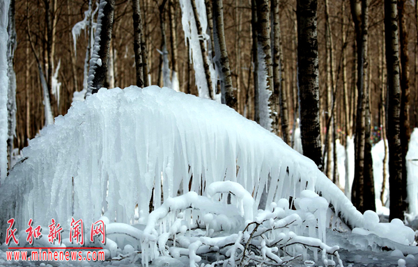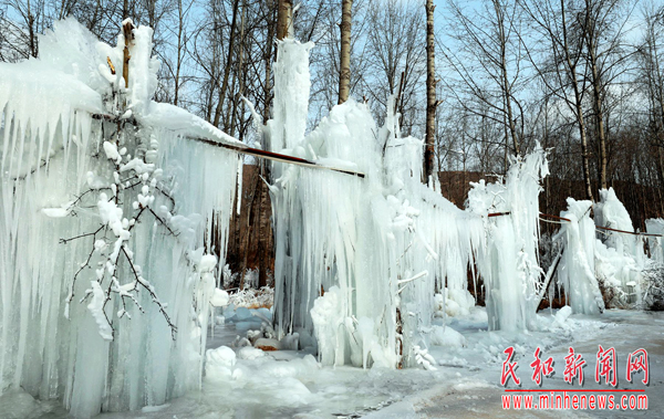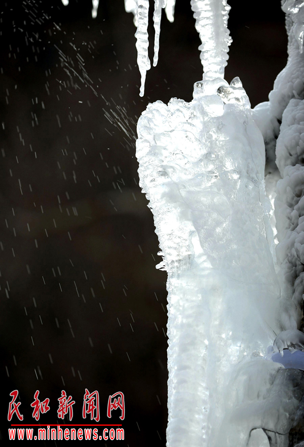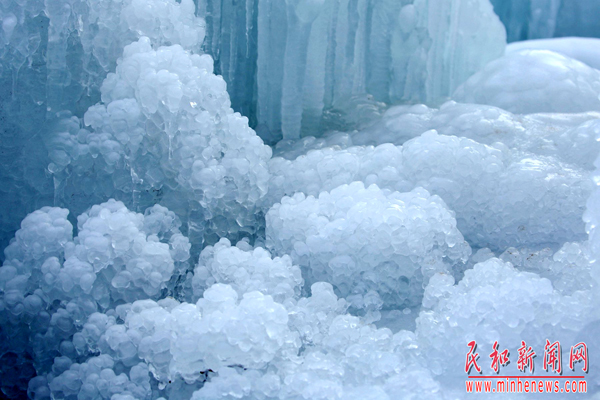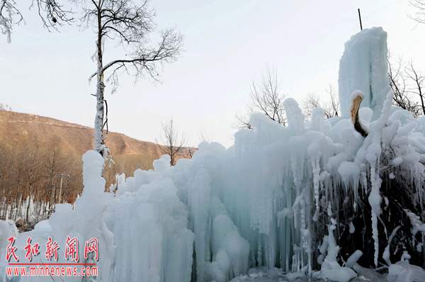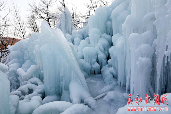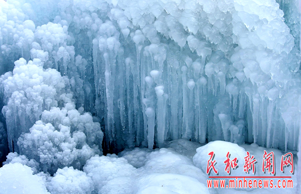 民和新闻网讯 凛冽的寒风吹过,使昔日的潺潺流水凝成冰河。位于民和县西沟乡的天井峡,在这个冬季,展现出了最绚烂的冰雪风情。景区的“冰雕世界”,已经迫不及待地向游客展现它的魅力。漫步在这“水晶”世界中,形态各异的冰雕有的像玉柳垂荫,瑰丽夺目;有的似“冰钟乳石”相聚丛生,含露滴流;有的如“冰石笋”,有的像雪莲。一簇簇,一团团,交相辉映,栩栩如生。放眼望去,一峰突起,峰峰叠连,形成了一幅壮美的立体画卷。(图片由民和县摄影家协会常务理事祁海宁提供)