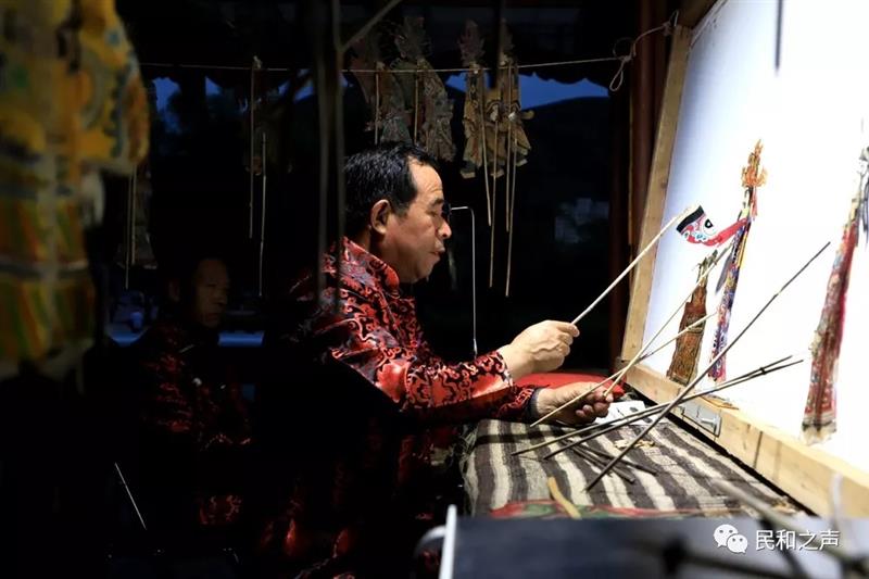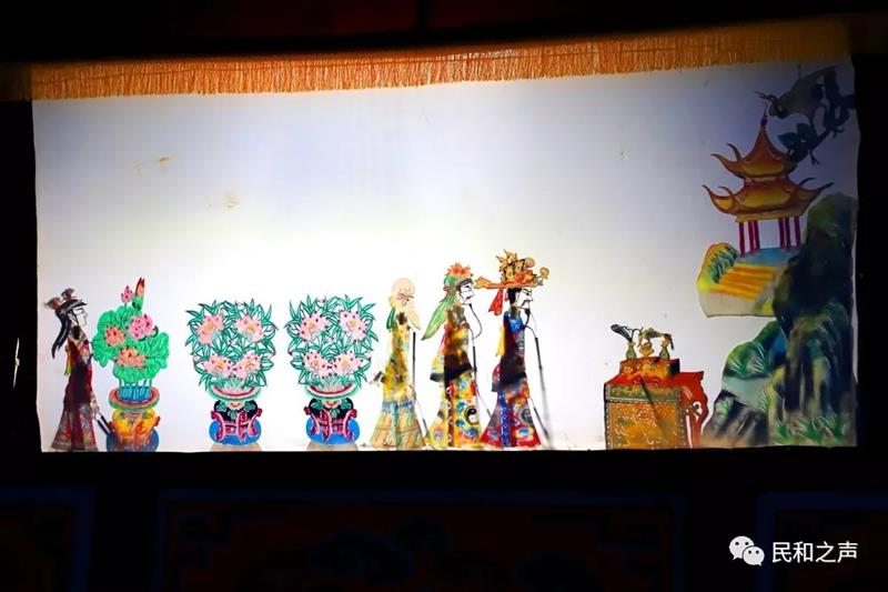 表演皮影戏,一块白布就是舞台,尺把长的小人在幕后被演员操作得得心应手,当灯光穿过皮影,白布另一侧便显现出色彩明艳、栩栩如生的人物、花鸟、楼宇等各种动态人物和静态事物,人物动作娴熟、花鸟形象逼真,素有“银灯映照千员将,一箱容下百万兵”的美称。