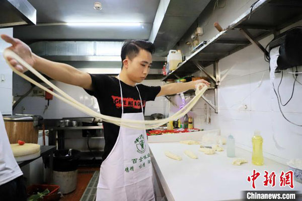 图为青海民和籍民众在深圳拉面店拉拉面。石延寿摄