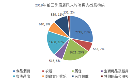 从消费结构看,八大类生活消费支出呈“七升一降”态势。其中:食品烟酒类、衣着类、居住类、生活用品及服务类、教育文化娱乐类、医疗保健类、其他用品及服务类人均消费支出分别为2249元、553元、1621元、515元、610元、839元、131元,同比分别增长8.1%、8.6%、18.5%、9.1%、24%、8.5%、24.5%;交通通信类人均消费支出为1468元,同比下降9.5%。