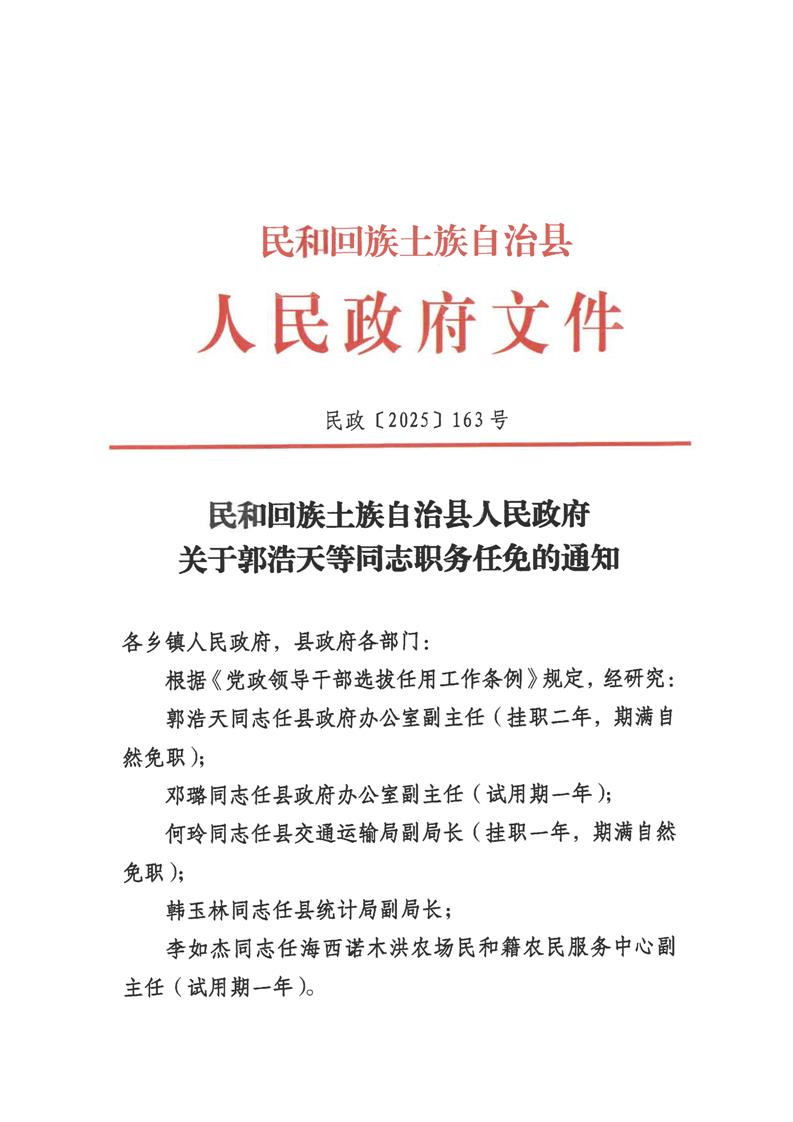 民和回族土族自治县人民政府关于郭浩天等同志职务任免的通知